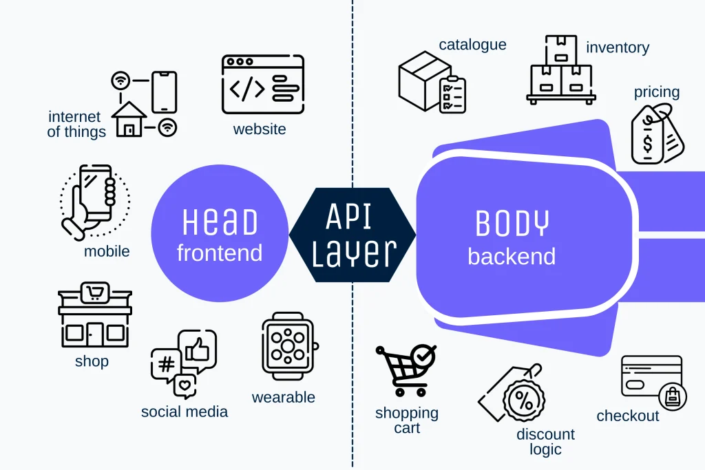 Headless Commerce là một cấu trúc thương mại điện tử tách biệt front-end và back-end, được liên kết với nhau bằng API vì thế doanh nghiệp có thể tận dụng lợi thế này để xây dựng trải nghiệm khách hàng trên tất cả các kênh và các thiết bị.